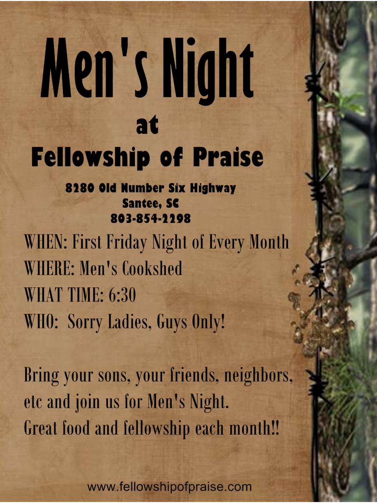The first Friday night of every month is Men and Boy’s Night. Invite a friend and come out for some great food, fellowship and a devotional. The men’s “cookshed” and ministry building is located to the rear of our main facility.